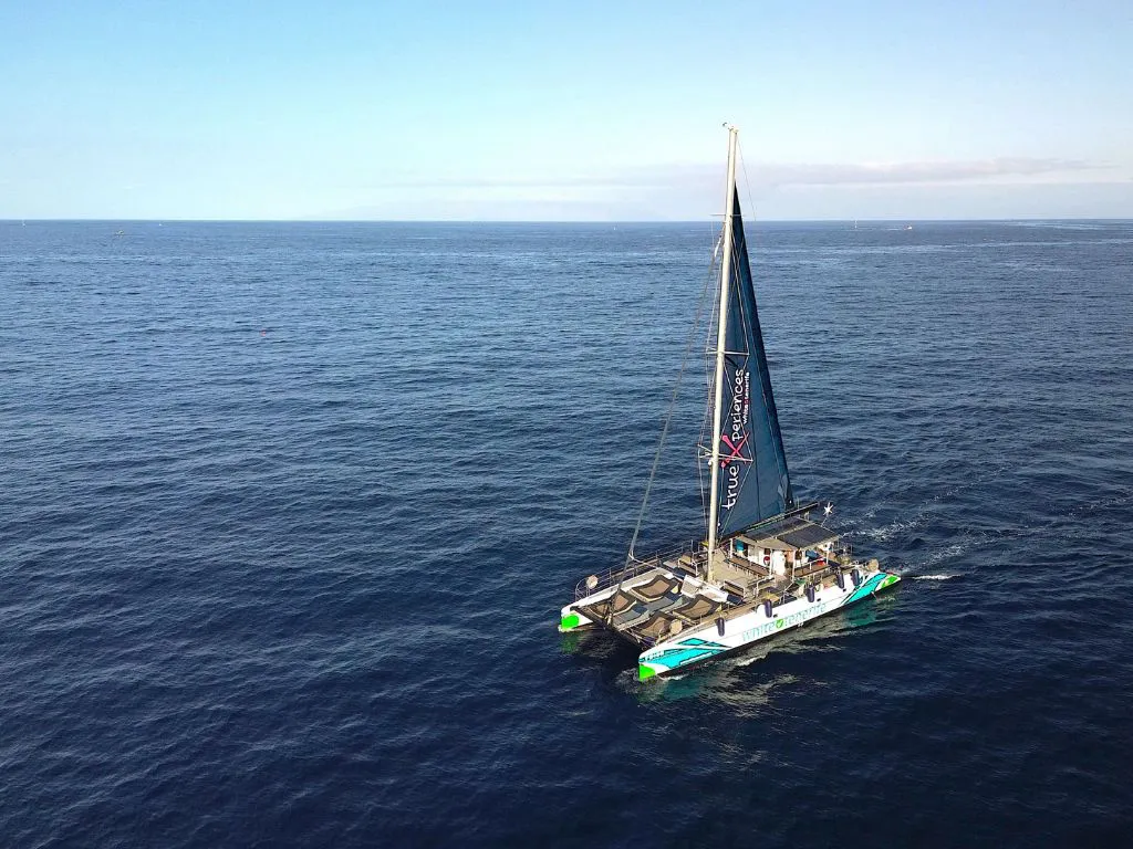 Geniet van de zon en de zeebries terwijl u uitkijkt over de hele zuidkust van het eiland. U zult walvissen en dolfijnen zien en bovendien biedt White Tenerife u de mogelijkheid om hun gesprekken duidelijk te beluisteren dankzij een uitstekende onderwater geluidsinstallatie met luidsprekers op het dek.